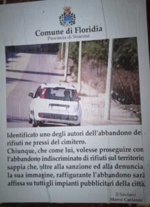 “Identificato uno degli autori dell’abbandono dei rifiuti nei pressi del cimitero. Chiunque, che come lui, volesse proseguire con l’abbandono indiscriminato di rifiuti sul territorio sappia che, oltre alla sanzione e alla denuncia, la sua immagine raffigurante l’abbandono sarà affissa su tutti gli impianti pubblicitari della città”. È il messaggio che campeggia sui manifesti affissi nella giornata di ieri su tutti gli impianti pubblicitari di Floridia. Si tratta di una delle tante iniziative del sindaco Marco Carianni, con l’obiettivo di contrastare il cronico problema relativo all’abbandono abusivo di rifiuti.