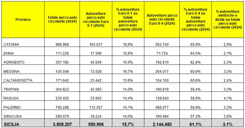 In Sicilia circolano ancora oltre 2,14 milioni di vetture con una classe di emissioni Euro 4 o inferiore, il 61,1% del totale, di cui quasi 551mila addirittura Euro 0-1 (15,7%).