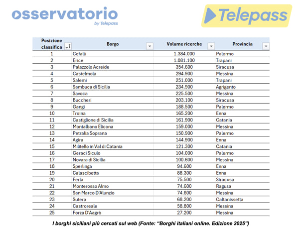 Cefalù è il borgo siciliano più ricercato e figura anche tra i primi dieci in Italia con 1.384.000 ricerche. Erice, seconda nella classifica regionale, arriva a 1.081.100 mentre Palazzolo, terza in Sicilia, si ferma a 354.600 ricerche.