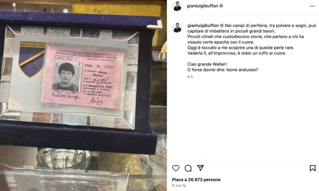 Tutto nasce da un post pubblicato questa mattina sui canali social da Buffon, che ha condiviso una tessera del settore giovanile di Zenga, risalente alla stagione 1970-1971, quando l’allora “uomo ragno” difendeva i pali del Macallesi 1927.