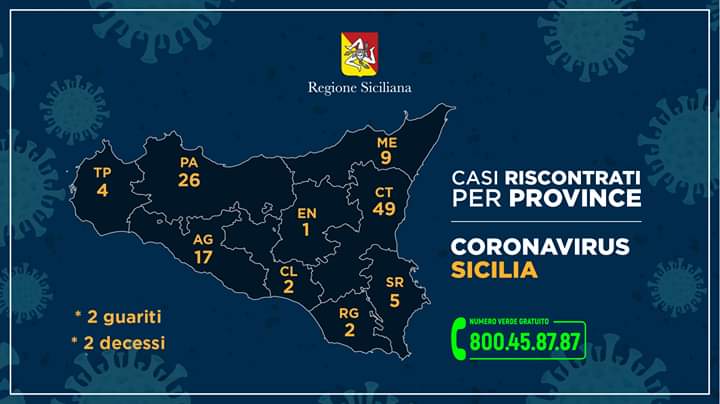 In totale sono 115 i pazienti, di cui 33 ricoverati (cinque in terapia intensiva), 78 in isolamento domiciliare, due guariti e due deceduti: Agrigento, 17; Caltanissetta, 2; Catania, 49; Enna, 1; Messina, 9; Palermo, 26; Ragusa, 2; Siracusa, 5; Trapani, 4.