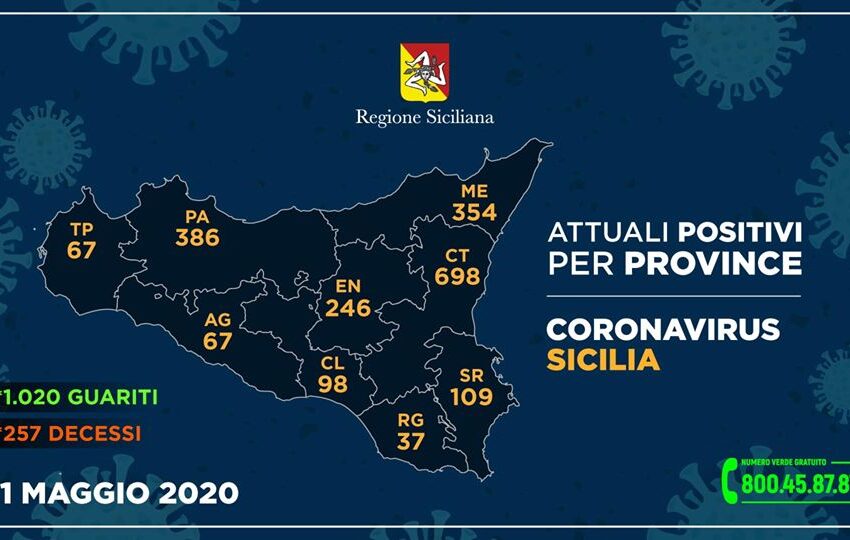 Questa la divisione degli attuali positivi nelle altre province: Agrigento, 67 (0 ricoverati, 69 guariti e 1 deceduto); Caltanissetta, 98 (15, 53, 11); Catania, 698 (64, 254, 94); Enna, 246 (58, 146, 29); Messina, 354 (64, 151, 52); Palermo, 386 (57, 127, 31); Ragusa, 37 (4, 50, 7); Trapani, 67 (2, 67, 5).