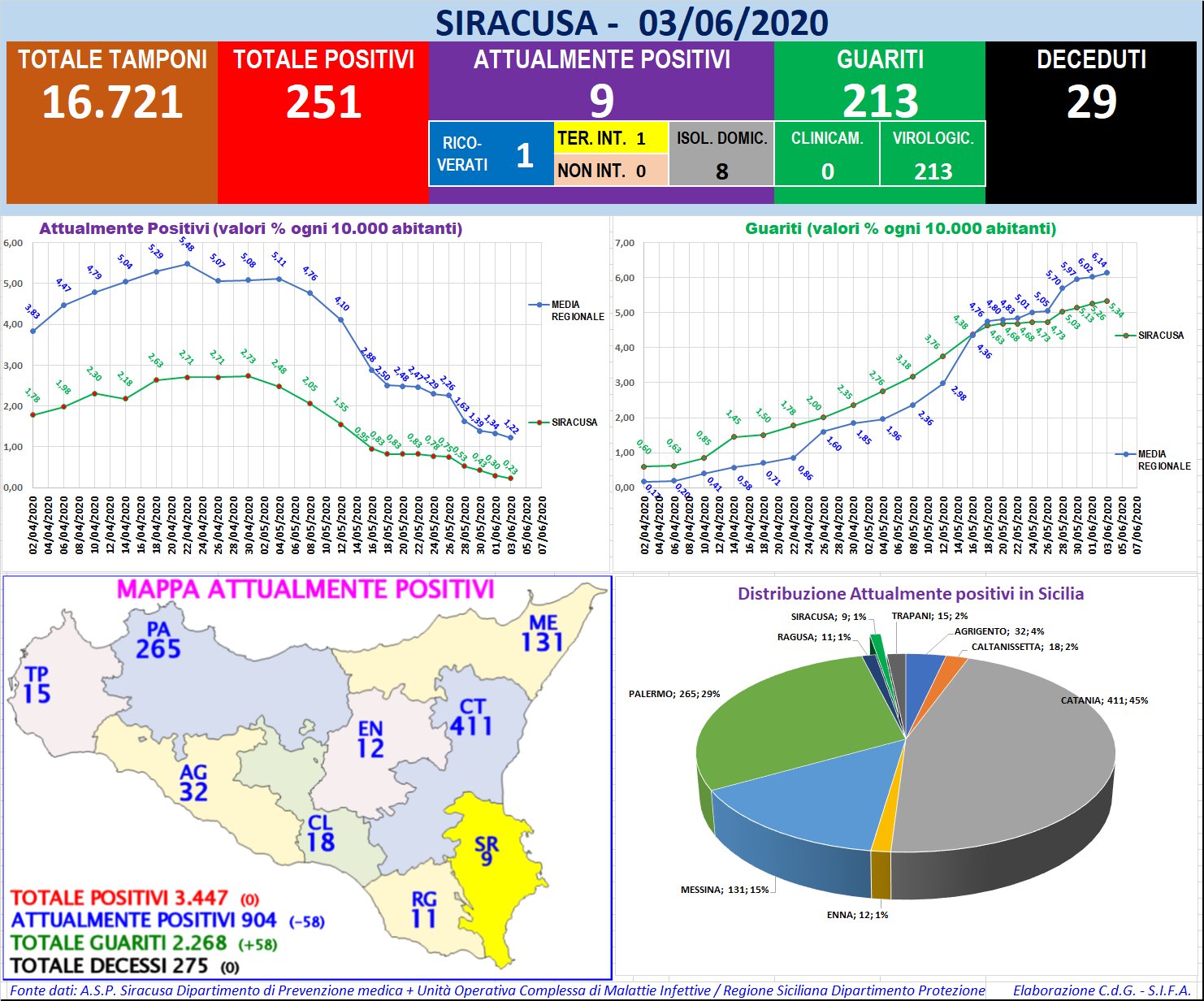 Dalla comparsa del coronavirus, sono stati 251 i contagiati in provincia di Siracusa. Ad oggi sono stati effettuati 16.721 tamponi. Attuale tasso positivi a 0,23 per 10.000 abitanti.