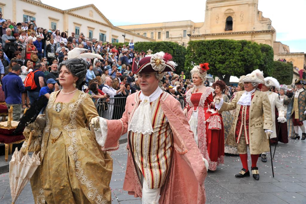 Dall’Infiorata al Gran Palio dei Tre Valli il passo è breve. E a rilento, proprio come l’incedere del Corteo Barocco di Noto protagonista della rievocazione storica settecentesca per un grande evento dopo l’altro. Dall’Infiorata appena conclusa, appunto, al Gran Palio dei Tre Valli in programma il 2 giugno sempre a Noto, con le suggestive voci del Gran Cerimoniere, Salvatore Figura e dell’Araldo delle Grida, Peppe Montalto (entrambi nella foto), a capo dei figuranti di un’associazione, quella diretta dal prof. Corrado Di Lorenzo, che compie 20 anni. Si sono appena spenti i riflettori sull’Infiorata 2019 ma quelli rivolti verso il Corteo Barocco rimangono sempre accesi. Perché in occasione di questo compleanno speciale gli appuntamenti si sono quasi triplicati. E arricchiti grazie alle co-partecipazioni dei tradizionali gruppi Real Marina di Caltanissetta, Musici e Sbandieratori Città di Noto, il Gruppo Astoria, il Gruppo Tamburi Reali di Comiso e Le Maschere di Mario del ‘700 veneziano, quest’ultima associazione ospite d’onore proveniente proprio da Venezia. E adesso tutti concentrati verso il Gran Palio dei Tre Valli di Sicilia, una sorta di reunion delle varie associazioni storiche isolane che porteranno ognuno la propria storia per le strade della città barocca. Un altro momento unico, storico e suggestivo, tutto da non perdere.