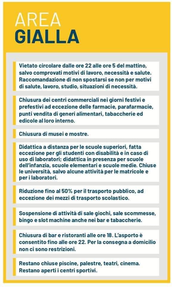 Area gialla significa che torna di nuovo possibile spostarsi tra Comuni. Bar e ristoranti possono consentire consumazioni al loro interno e svolgere servizio ai tavoli fino alle 18; fare asporto dalle 5 di mattina fino alle 22; fare consegne a domicilio senza orario.