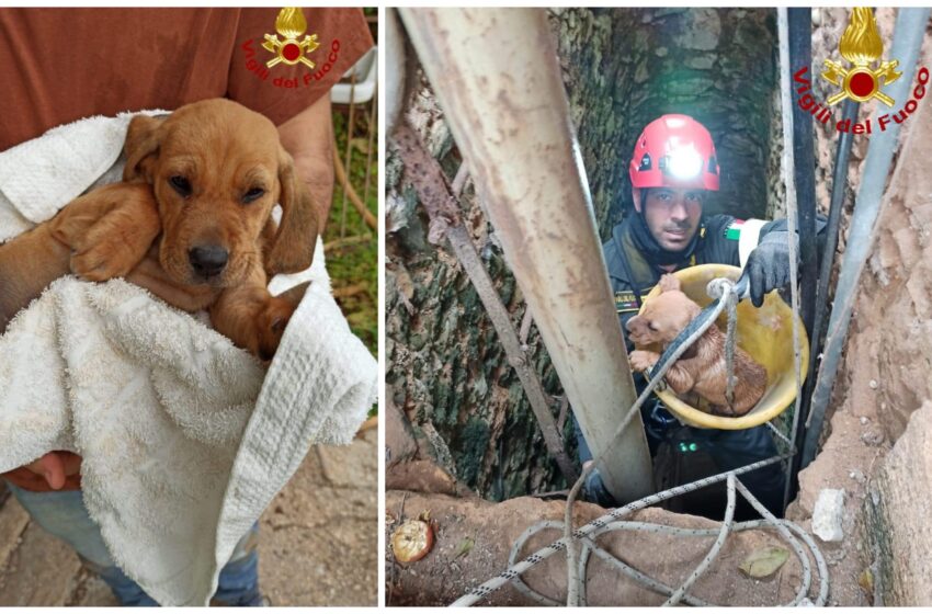 Cucciolo salvato dai Vigili del Fuoco, era precipitato in un pozzo profondo 12 metri