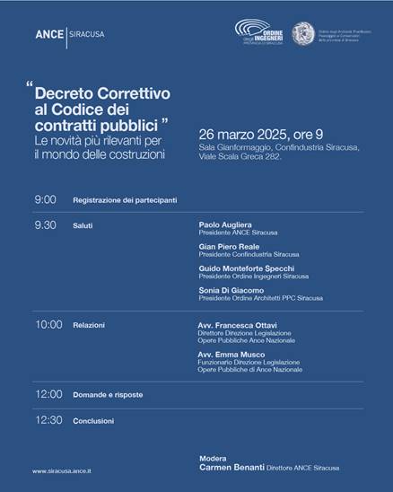 Domani, mercoledì 26 marzo, con inizio alle ore 9.00, nella Sala “U. Gianformaggio” di Confindustria Siracusa, Ance Siracusa organizza un incontro volto a illustrare le principali novità introdotte dal Decreto Correttivo al Codice dei Contratti Pubblici.