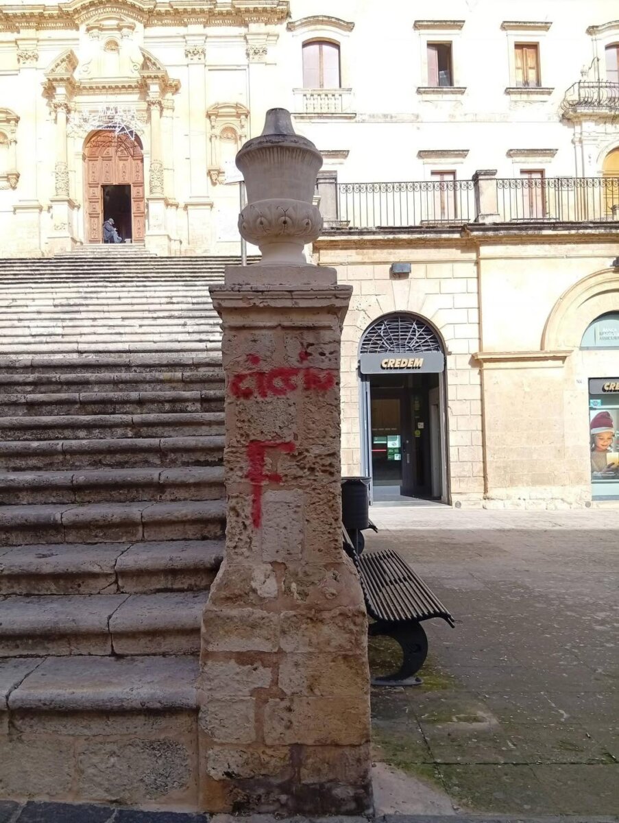 Il centro storico di Noto deturpato da scritte con bomboletta di colore rosso, sono lettere-forse iniziali- un nome: uno sfregio. Il sindaco, Corrado Figura esprime tutta la sua amarezza attraverso i social e parla di “immagini che sono un insulto al nostro patrimonio, alla nostra storia e a tutti i cittadini che amano e rispettano la nostra città.Deturpare il cuore del centro storico con questo squallore non è una bravata, è un reato contro la comunità”.Il primo cittadino assicura il massimo impegno nell’individuazione dei responsabili di questo gesto. “Non daremo tregua a chi l’ha fatto- avverte il sindaco- Grazie al nostro sistema di telecamere di sicurezza, l’autore sarà individuato e lo perseguiremo con ogni mezzo consentito dalla legge. Chi pensa di poter calpestare la bellezza di Noto restando impunito si sbaglia di grosso. Pagherà fino all’ultimo centesimo per il danno arrecato e per il ripristino dei luoghi”.