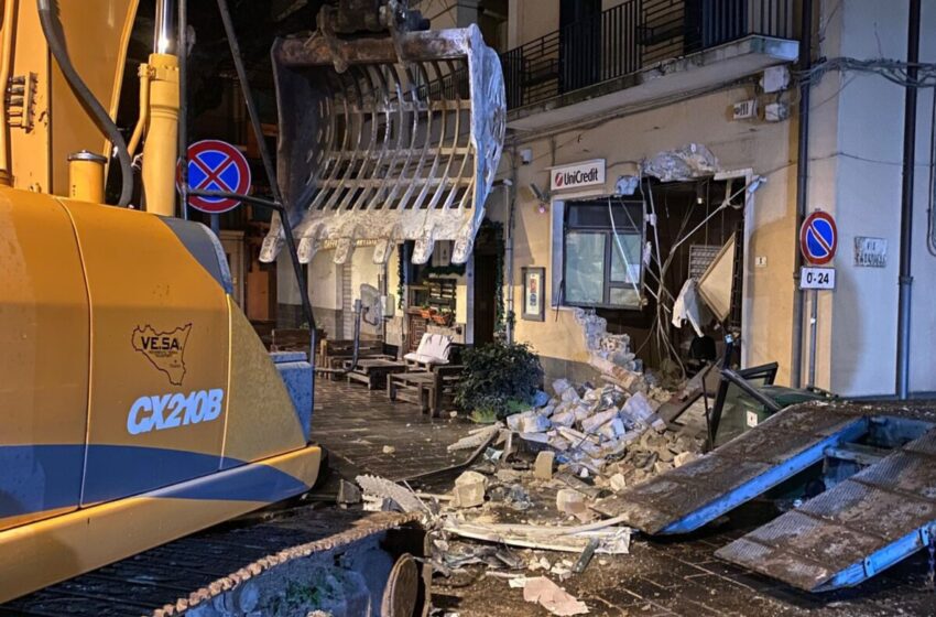 Quasi nelle stesse ore, a Buccheri, un’altra banda entrava in azione con una modalità differente ma altrettanto distruttiva. Una pala meccanica è stata utilizzata per abbattere parte della parete della filiale Unicredit, creando un accesso diretto ai locali interni e alle casse. L’irruzione è stata rapida ed ha provocato gravi danni strutturali all’edificio, prima che i responsabili si dileguassero con il denaro.