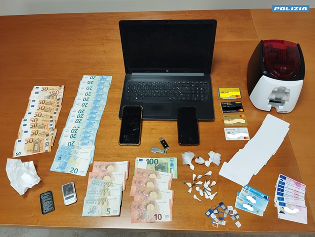 Sequestrati la stampante verosimilmente usata per riprodurre i documenti, un bilancino di precisione, materiale per il confezionamento della droga e 8 grammi di mannite, utilizzata per il taglio degli stupefacenti.