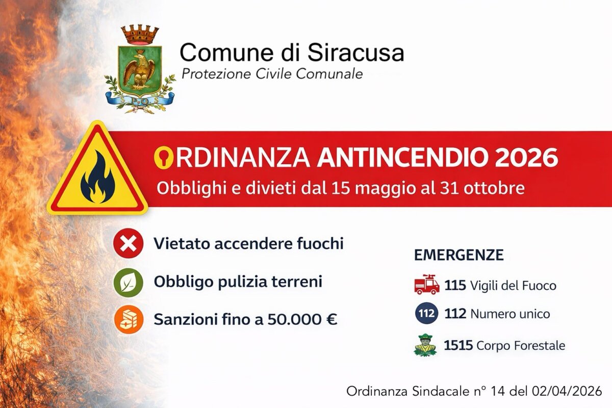 In vista della stagione estiva, purtroppo propizia per gli incendi, il Comune di Siracusa rafforza le misure di prevenzione. Su proposta del settore Protezione Civile, è stata emanata l’ordinanza sindacale che introduce obblighi e divieti per tutto il 2026, con particolare riferimento al periodo compreso tra il 15 maggio e il 31 ottobre. A illustrarne contenuti e finalità è l’assessore alla Protezione civile, Sergio Imbrò.
