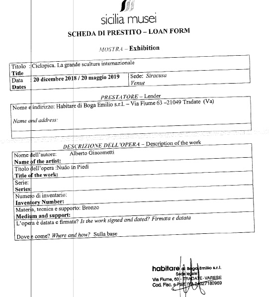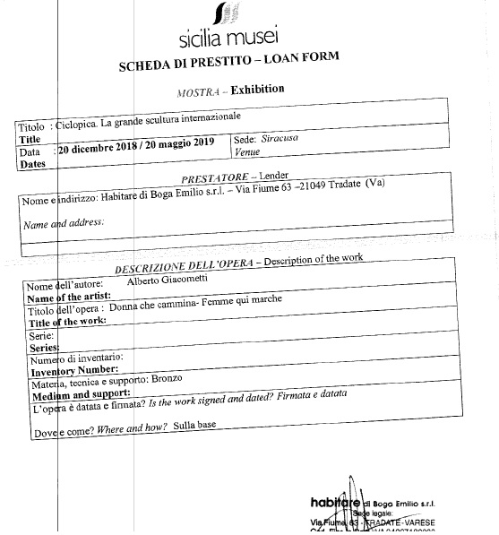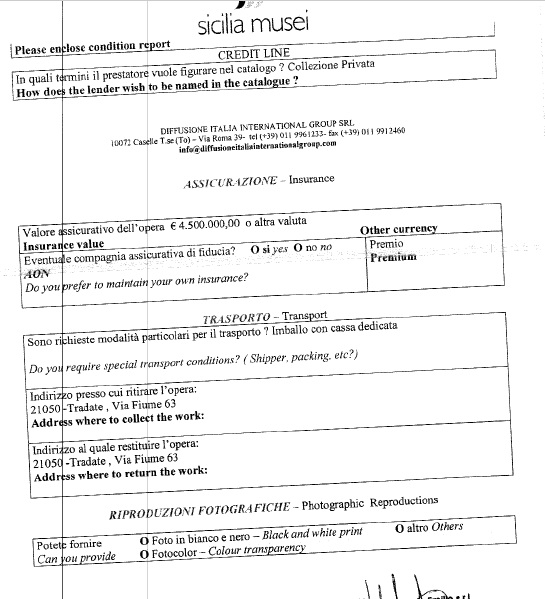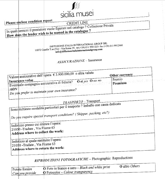 Vi riportiamo di seguito alcuni dei documenti consegnati anche alla nostra redazione. Si tratta di un voluminoso incartamento che comprende anche il contratto tra Sicilia Musei e Diffusione Italia, società di Torino che mette a disposizione le oltre cento sculture esposte. Ma tra le carte più interessanti ci sono le schede di prestito, le assicurazioni e quello che in gergo viene detto “passaporto” dell’opera, con i visti del Ministero dei Beni Culturali.