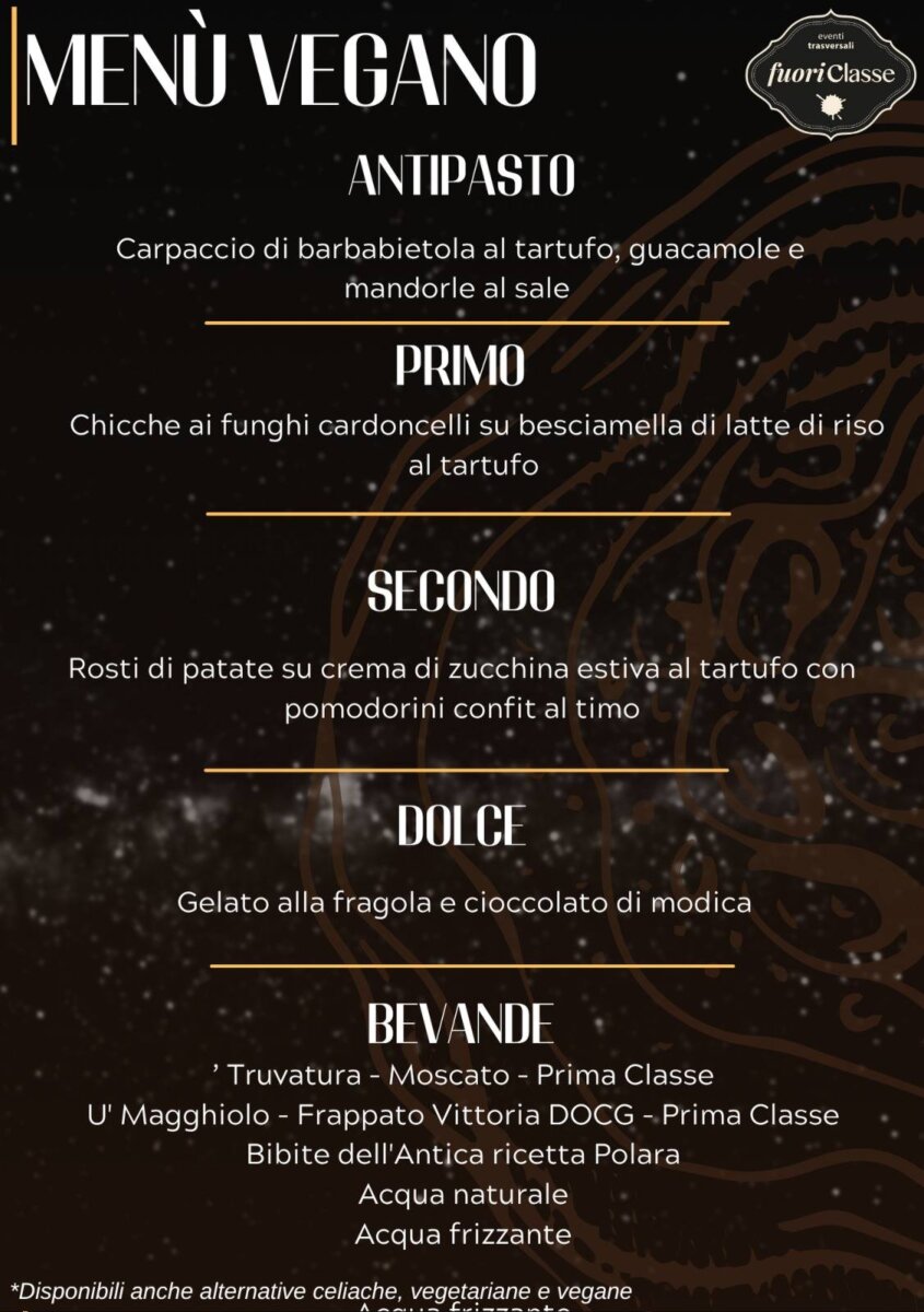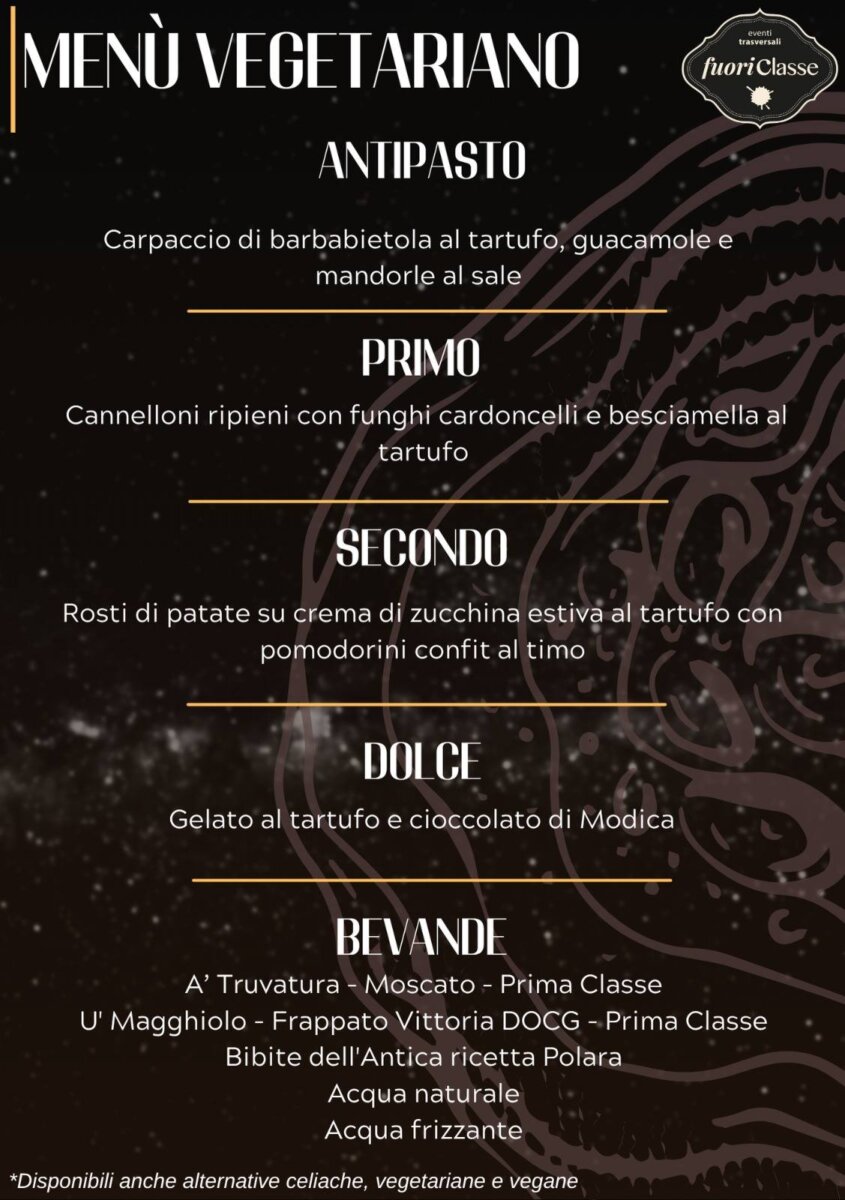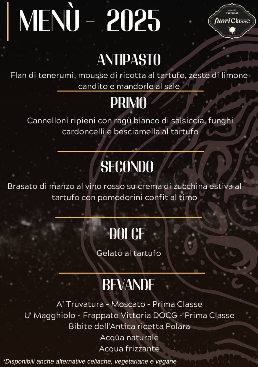 Protagonista assoluto della serata sarà come sempre il tartufo nero, re della tavola, protagonista di un raffinato menù ideato dagli chef di Fuori Classe, noti per la loro capacità di fondere tradizione e creatività. Una cena pensata per valorizzare i sapori autentici della Sicilia, in un percorso gastronomico che saprà sorprendere anche i palati più esigenti.