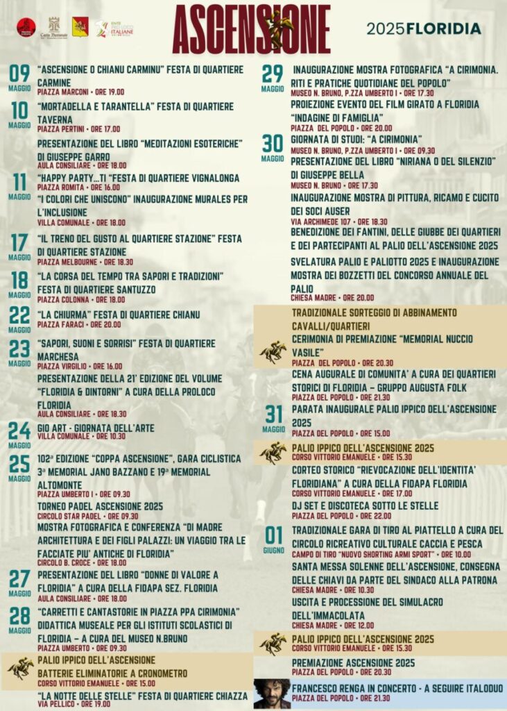 “La Festa dell’Ascensione rappresenta per la nostra comunità un momento di particolare significato, attraverso il Palio Ippico, le feste di quartiere e le numerose iniziative culturali, la manifestazione celebra la nostra identità e il legame profondo con la storia del paese. – ha scritto il sindaco di Floridia, Marco Carianni, sui canali social – Invitiamo tutti a partecipare e a condividere questo importante appuntamento, coinvolgendo familiari, amici e conoscenti. Facciamo sentire forte la nostra volontà di essere una comunità viva, coesa e orgogliosa della propria tradizione”.