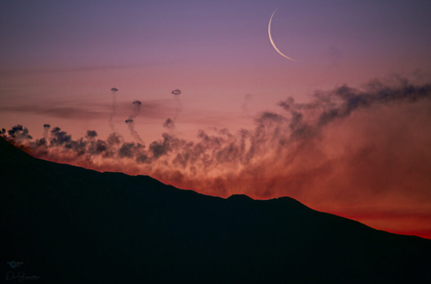 “Era l’alba del 7 aprile e da Gangi ho immortalato lo spettacolo offerto dall’Etna”, racconta Dario Giannobile. La Nasa descrive così il fenomeno: “…Tecnicamente conosciuti come anelli vorticosi, le pareti del vulcano rallentano leggermente l’esterno degli sbuffi di fumo emessi, facendo muovere più velocemente il gas interno. Si sviluppa un cerchio di bassa pressione che fa sì che lo sbuffo di gas e di cenere vulcanica emessa si avvolga in un anello, una struttura geometrica familiare che può essere sorprendentemente stabile mentre sale. Gli anelli di gas sono piuttosto rari e richiedono una coincidenza tra la giusta geometria del condotto, la giusta velocità del gas espulso e la relativa calma dell’atmosfera esterna”.