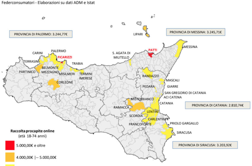 Per quel che riguarda le province, Palermo è quarta in Italia per totale giocato con 2,8 miliardi di euro dopo Roma, Napoli e Milano. Catania è sesta con 2,1 miliardi. Nella classifica del totale giocato nei soli Comuni capoluogo di provincia, invece, Palermo è quarta con 1,49 miliardi e Catania è quinta con 723 milioni.