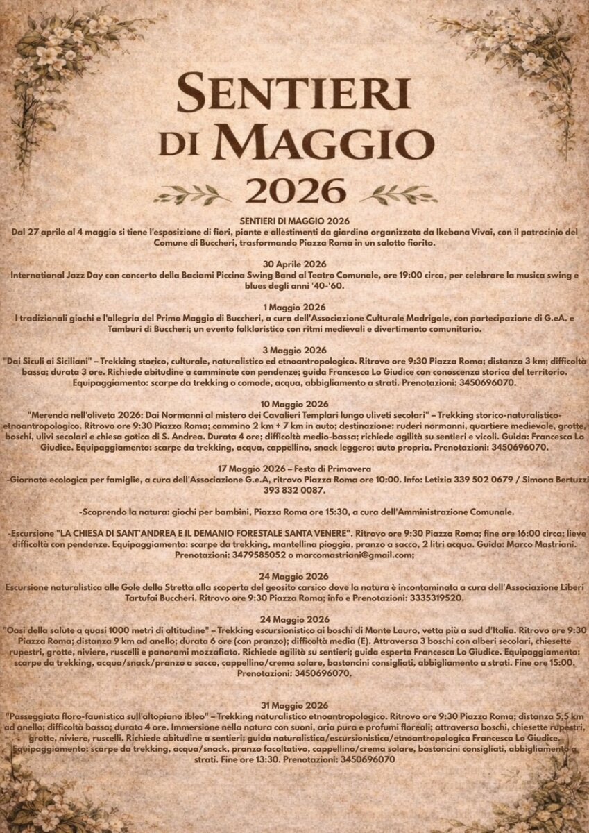 Un ricco programmi di eventi per celebrare la straordinaria identità del territorio. Il Comune di Buccheri è pronto a proporre l’edizione 2026 di “I Sentieri di Maggio”, tra natura incontaminata, paesaggi mozzafiato, tradizioni vive e un patrimonio agroalimentare di eccellenza.