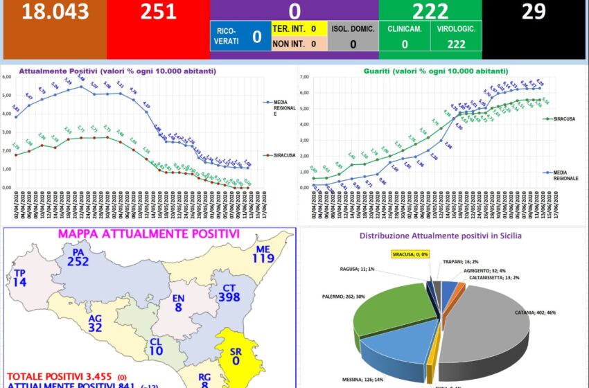 Al momento, quella di Siracusa rimane l’unica provincia ad avere raggiunto il risultato di azzerare la presenza di coronavirus sul proprio territorio. Si avvicinano al traguardo Ragusa, Enna e Caltanissetta.