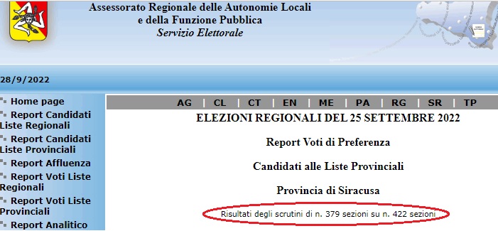 Ore 10.40 del 28 settembre 2022. A tre giorni dall’election day ed a 45 ore dall’avvio delle operazioni di spoglio, sul sito del servizio elettorale regionale l’unica provincia senza dati definitivi è quella di Siracusa. I candidati hanno potuto consultare in Prefettura i numeri finali che, però, non sono ancora stati caricati dal servizio dell’assessorato regionale alle Autonomie Locali. I cittadini-elettori, a tre giorni dal voto, devono “accontentarsi” di 379 sezioni su 422 provinciali.
