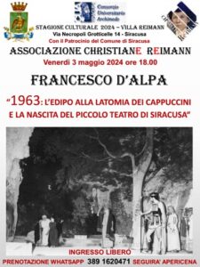 Il progetto dal titolo “L’Edipo alla Latomia dei Cappuccini e la nascita del Piccolo Teatro di Siracusa” del dott. Francesco D’Alpa a Villa Reimann, venerdì 3 maggio, dalle ore 18.