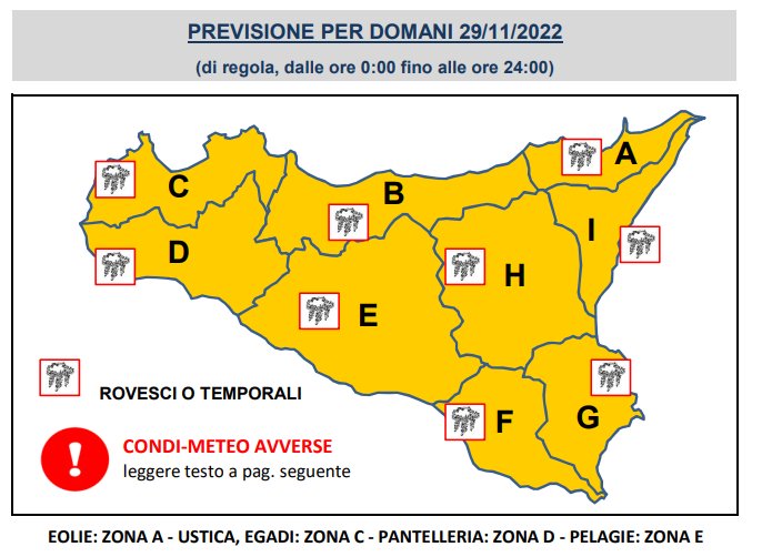 Dopo la tregua odierna, torna il maltempo. Il bollettino del Dipartimento Regionale di Protezione Civile ha diramato l’allerta meteo arancione in tutti i settori dell’Isola, compresa la provincia di Siracusa. Previste dalle prime ore di domani, martedì 29 novembre, e per le successive 18-24 ore precipitazioni sparse a carattere di temporale “accompagnate da rovesci di forte intensità, attività elettrica e forti raffiche di vento”.