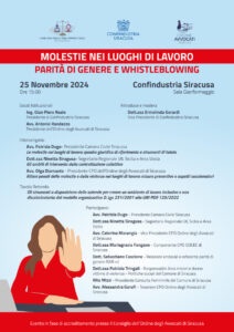 Si terrà lunedì 25 novembre 2024 con inizio alle ore 15, nella sede di Confindustria Siracusa, il convegno “Molestie nei luoghi di lavoro, parità di genere e whistleblowing”, organizzato in collaborazione con il CPO dell’Ordine degli avvocati di Siracusa. L’obiettivo dell’evento, a cura del Gruppo Tecnico Education e Capitale umano di Confindustria Siracusa, presieduto dalla Vice Presidente di Confindustria Siracusa Ermelinda Gerardi,  è promuovere all’interno delle aziende buone pratiche per prevenire, individuare e gestire gli atti di molestie e violenza di genere. L’incontro intende affrontare il tema illustrando il quadro normativo di riferimento, il ruolo svolto dalla contrattazione collettiva, le misure per il contrasto e la prevenzione dei fenomeni di violenza e molestie, gli strumenti di tutela per le lavoratrici e i lavoratori vittime di discriminazioni.