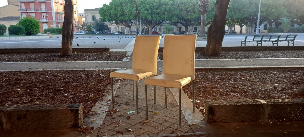 Uno strano oggetto rimane legato con la catena ad un palo dell’illuminazione artistica della piazza. Il catafalco è forse una bancarella. Ma sta sempre lì, legato a quel palo fronte chiesa di Santa Lucia. Forse è persino percepito come normale. Quasi quanto quelle due sedie abbandonate in un angolo, o quel copertone a centro di aiuola.