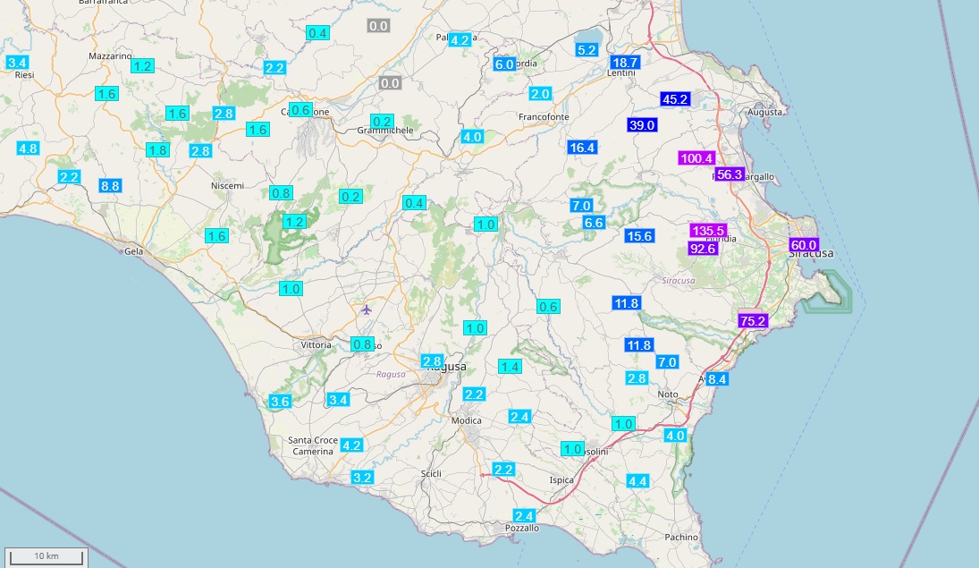 La pioggia non ha dato tregua per tutta la notte. Un autentico fortunale si è abbattuto su Siracusa e parte della provincia. Caduta una quantità di acqua impressionante. Il dato cumulato delle ultime 24 ore parla chiaro: 60mmm sul capoluogo, 75mm su Cassibile, 100.4 mm su Melilli e ben 135,5 tra Floridia e Solarino. In un breve lasso di tempo, precipitazioni di un’intera stagione o quasi.