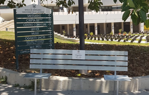 “In memoria della corrente pandemia che ci ha costretti ad una forzata immobilità e al distanziamento fisico, le donne Inner, grazie alla generosità del fabbro Dario Cirasa, che ne ha curato la realizzazione, hanno donato al Santuario una panchina Anti-Covid. Una normale panchina che rispetta il distanziamento fisico con uno spazio di un metro, come da normativa – sottolinea la Presidente Maria Tuccitto Rigoli – ma che non deve essere un distanziamento sociale. Una panchina che, per la sua originale conformazione, permette ai disabili di poter – finita la pandemia – stare seduti vicini”.