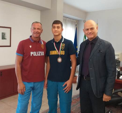 Il Questore Benedetto Sanna ha ricevuto l’allenatore delle Fiamme Oro e il giovane campione, complimentandosi per l’attività e i risultati.