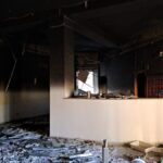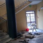 I vetri delle porte d’ingresso sono quasi tutti spaccati o in frantumi. In lontananza, si intravede il disastro e il degrado con stanze e locali vandalizzati. Una distesa di resti: di arredamenti, suppellettili, intonaci ed altri elementi. L’aria è intrisa di un mix di acre odore di bruciato e persistente puzza.