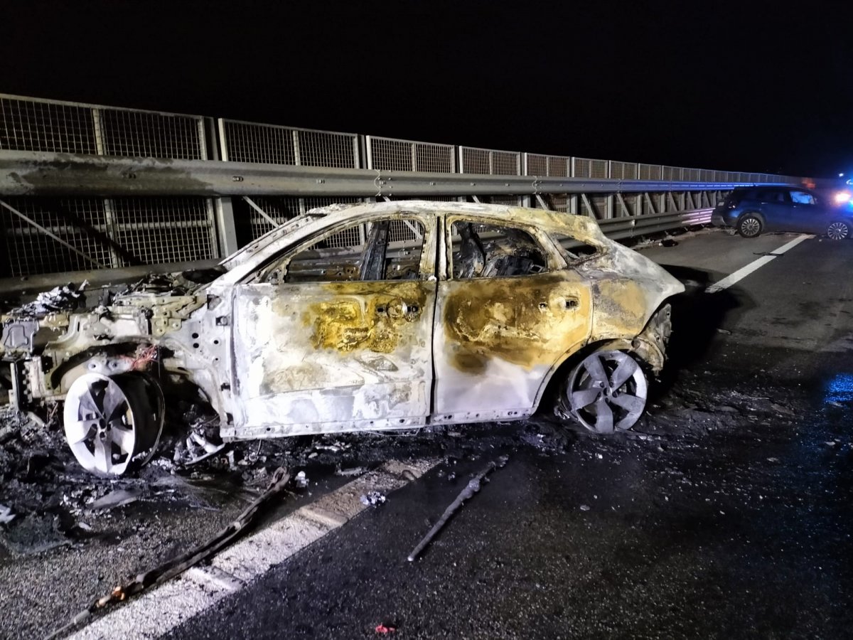 Rocambolesco incidente in autostrada, Jaguar distrutta dalle fiamme: nessun ferito
