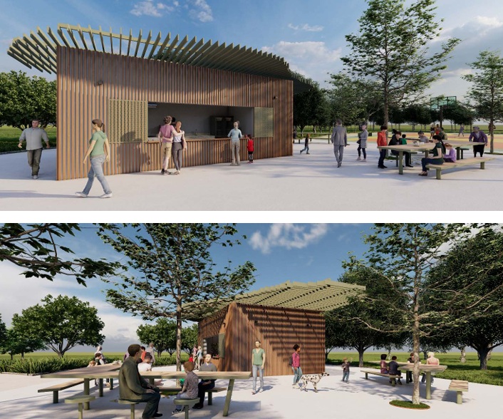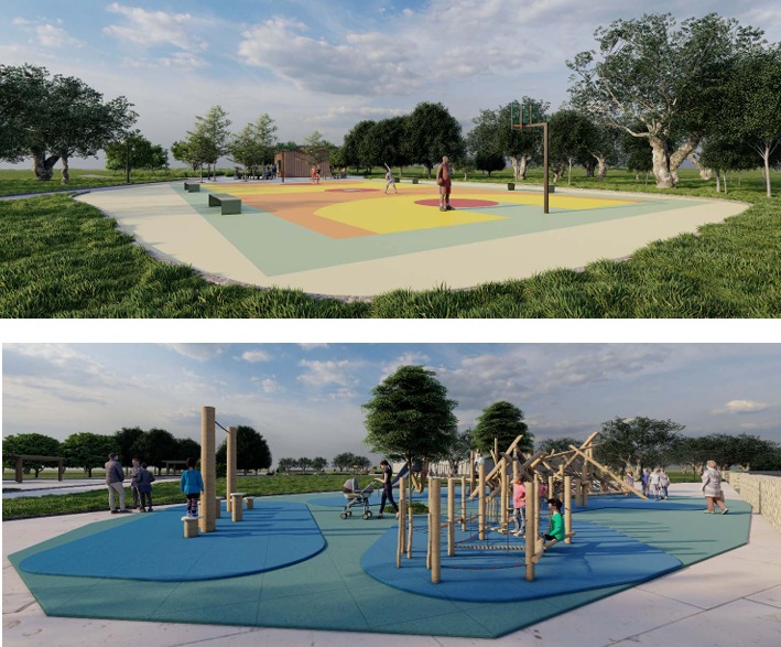 Tra le realizzazioni figura anche un punto ristoro (con annessi servizi igienici). Si tratta di un volume compatto (circa 6×9 metri) con struttura in acciaio immaginato rivestito in doghe lignee verticali e copertura performante e stratificata per elevata efficienza energetica e resistenza agli agenti atmosferici. Presente anche un’area sportiva (campi da gioco polifunzionali) e aree gioco per bambini e famiglie. Anche in questi ambiti si mantiene il principio di non invasività, quindi nessuno scavo ma sistemi a riporto e strati drenanti.
