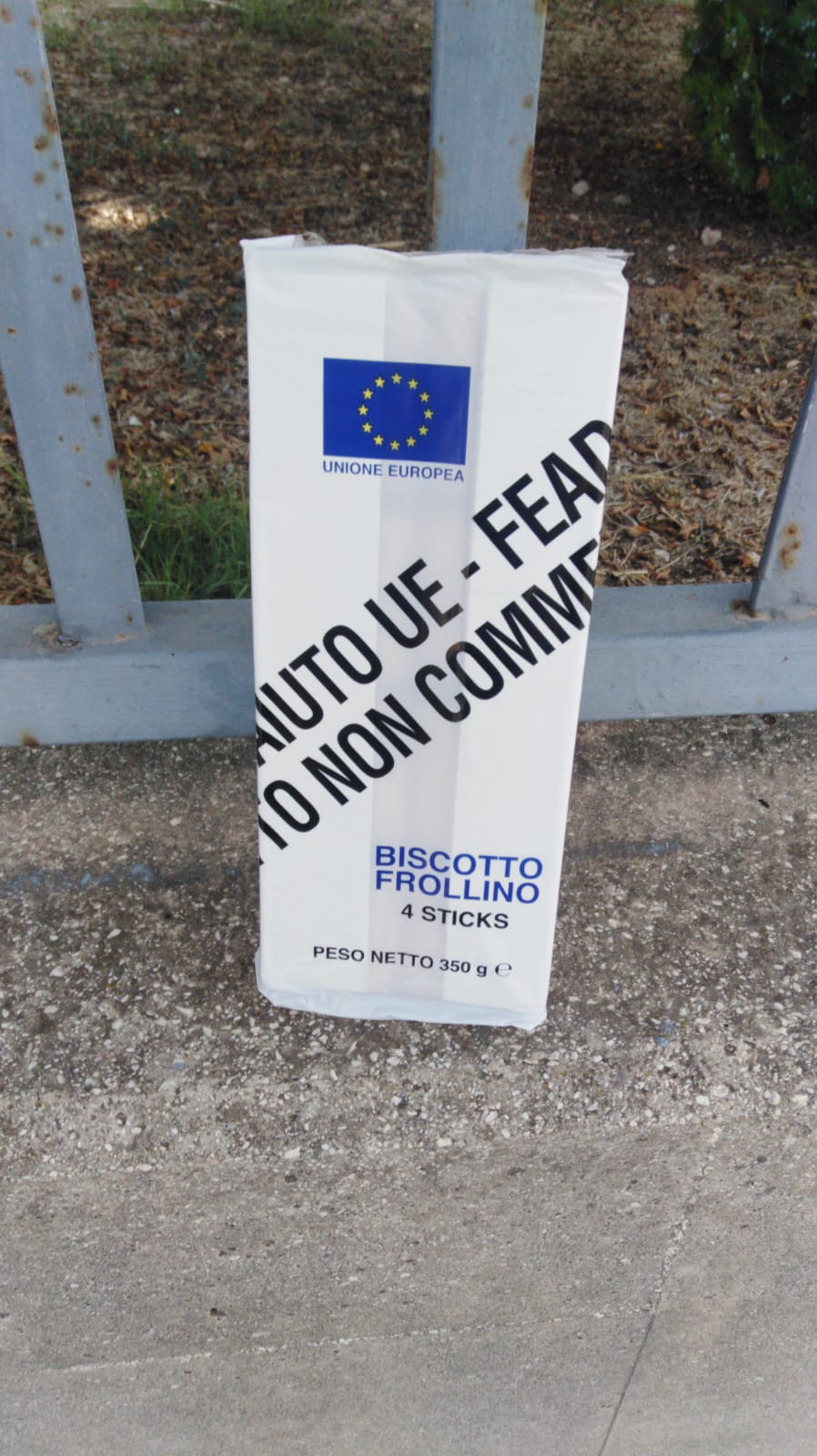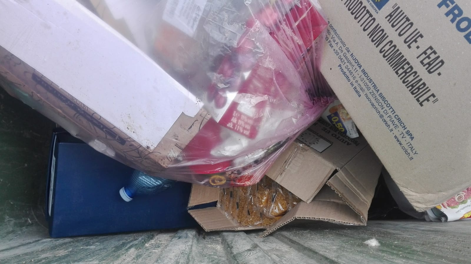 Alcuni scatoloni pieni di aiuti alimentari sono stati buttati nei cassoni verdi della Mazzarona. Si tratta in particolare di frollini, biscotti tutti riportanti nella confezione la chiara indicazione “Aiuto Ue”, ovvero dell’Unione Europea con tanto di bandiera. Poco sotto, si intravedono anche confezioni di pasta, stesso scatolo con la dicitura Ue.