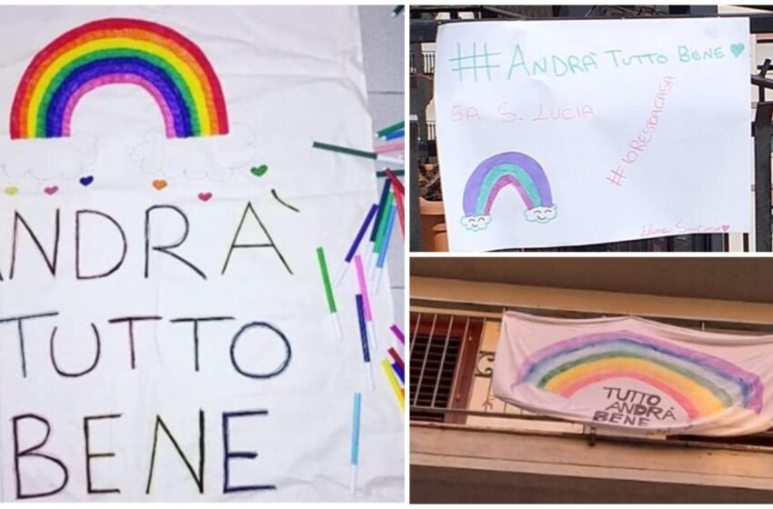 Gli arcobaleni vengono tracciati su pezzi di stoffa, cartone o fogli e poi appesi al balcone, alla finestra, su strada. Per ricordarci con la forza del colore che “andrà tutto bene”, la frase simbolo scelta per affrontare anche psicologicamente l’emergenza.