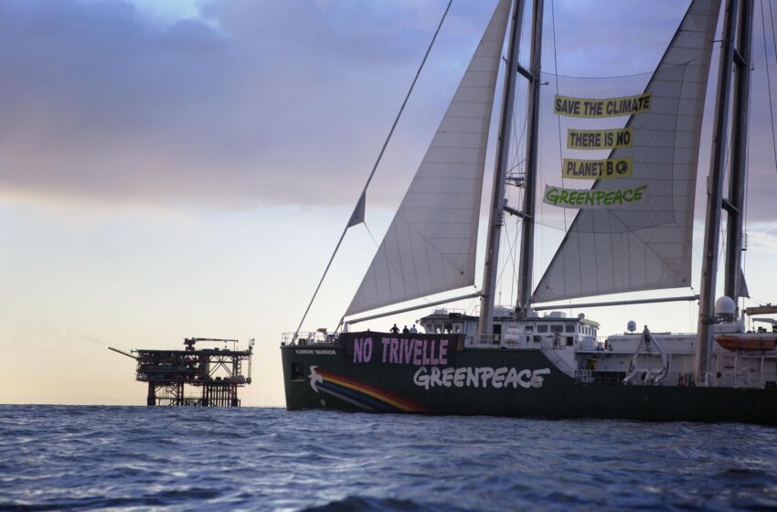 Activists aboard the Greenpeace ship, Rainbow Warrior unfurl a banner reading: “No Drilling” and ‘Save The Climate, There Is No Planet B’ as she sails past the Rospo B oil rig off the coast of Vasto. The environmental organisation warns that increased oil drilling activities across the Mediterranean could result in an accident that would cause irreversible damage to environment and livelihoods in the region. The Rainbow Warrior is currently on a ‘Mediterranean Energy Tour’, to campaign for a shift in energy investments away from fossil fuels towards renewable energy to help avert the worst impacts of climate change.
