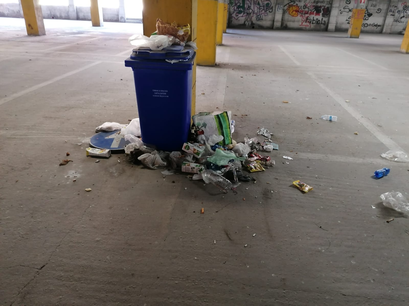 Molta plastica abbandonata nell’area riservata alla sosta delle auto, purtroppo si tratta di rifiuti abbandonati senza alcun criterio. Ma il Talete è anche diventato negli anni la casa degli ultimi. Vi vivono stabilmente 8 senza fissa dimora ed evidenti sono le tracce della loro presenza: giacigli di fortuna con cartoni distesi sul cemento, padelle, persino una pizza e piccole suppellettili personali. Al momento della bonifica, non erano all’interno del parcheggio e non si è valutato un eventuale sgombero.