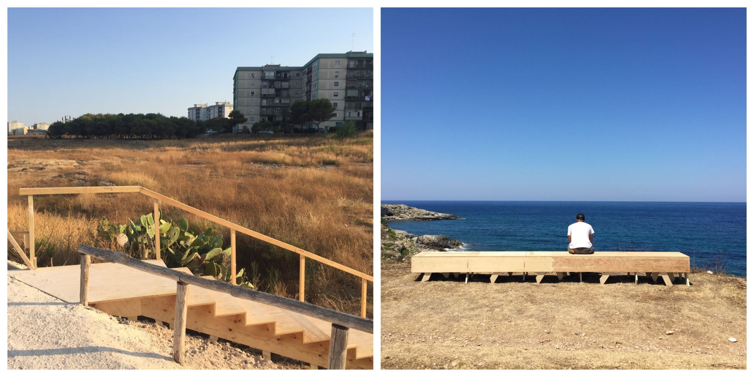 La scaletta e la panchina in legno sono state progettate e realizzate da tre giovani architetti, neolaureati a Siracusa, e rientravano tra i micro-cantieri per meglio connettere la pista ciclabile alla costa ed al solarium che d’estate viene montato proprio sotto la scogliera.