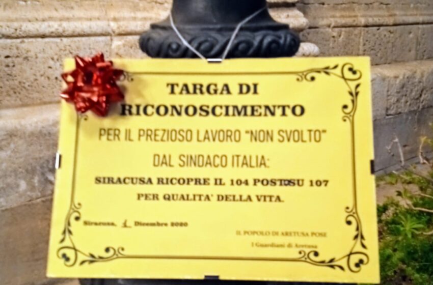 Una targa sotto palazzo Vermexio. L’associazione Guardiani di Aretusa protesta in questo modo e rende evidente il rammarico per l’esito del nuovo rapporto sulla qualità della vita nelle province italiane. Secondo i parametri analizzati da Italia Oggi e dall’Università La Sapienza di Roma, la provincia di Siracusa si piazza in fondo alla classifica: posizione numero 104 sulle 107 disponibili.