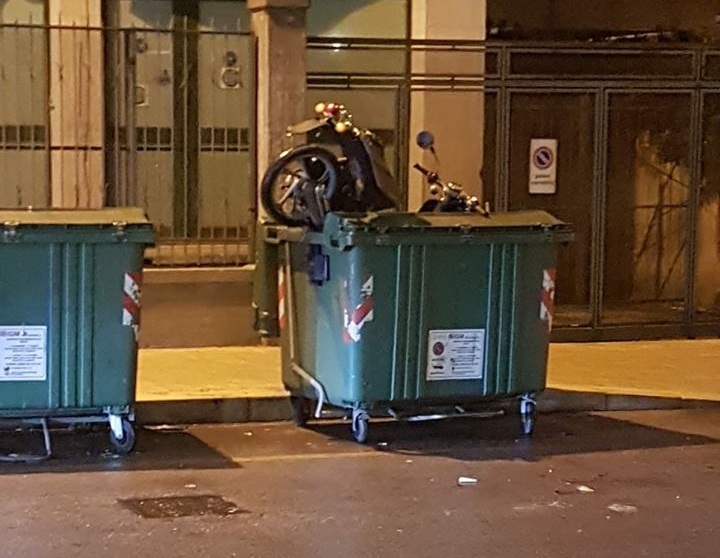 La foto è comparsa sui social ed ha immediatamente colpito. Curioso, d’altronde, è quanto immortalato. Uno scooter, sembrerebbe elettrico, “parcheggiato” all’interno di un cassonetto della spazzatura. E’ accaduto la notte scorsa in via Filisto, nei pressi del multisala Planet.