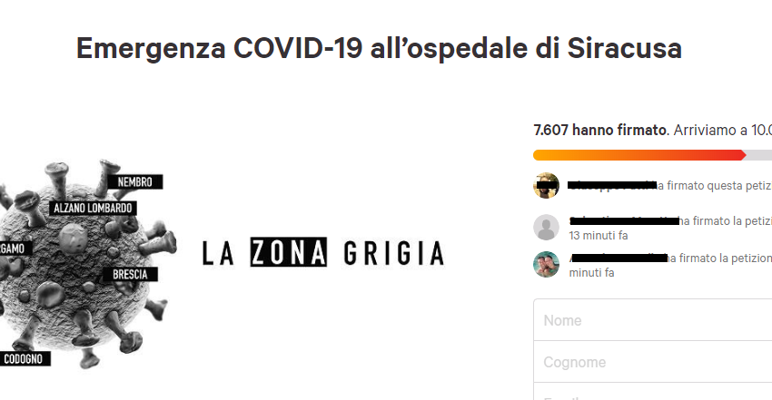 Oltre 7.600 firme nelle prime 24 ore. La petizione on line avviata su Change.org da Giuseppe Patti per chiedere la rimozione dei vertici Asp alla luce del servizio andato in onda su RaiTre nel corso della trasmissione Report. La petizione, che conta migliaia di condivisioni (oltre che di firme) ha l’obiettivo di chiedere la rimozione , questo il testo della petizione, l'”immediata del direttore generale e del direttore sanitario dell’Azienda Sanitaria di Siracusa. Abbiamo riscontrato guardando la puntata di lunedì 6 aprile del programma Report che a Siracusa l’emergenza Covid-19 viene gestita con delle enormi lacune procedurali. Molti cittadini non si sentono tranquilli e chiedono un sistema sanitario adeguato a contrastare questa epidemia. A Siracusa quanto visto su Report non tranquillizza i cittadini siracusani e da un’immagine del sistema sanitario siracusano al quanto deficitario. Avevamo un mese di vantaggio sui contagi e non è servito per porre in essere le migliori soluzioni che avrebbero consentito di limitarli almeno nel nostro territorio. Dalla gestione del Pronto Soccorso alla gestione dei tamponi. Il virus si è propagato all’interno dell’Ospedale Umberto I contaminando anche reparti sensibilissimi come quello di oncologia. Se ci fosse stata maggior celerità nell’effettuare i tamponi probabilmente avremmo avuto a Siracusa anche qualche decesso in meno”. La petizione è rivolta in primo luogo al presidente della Regione, Nello Musumeci.