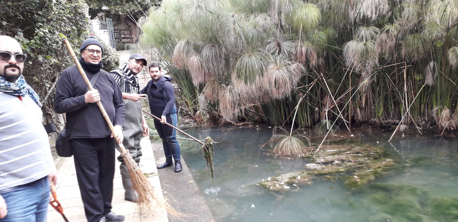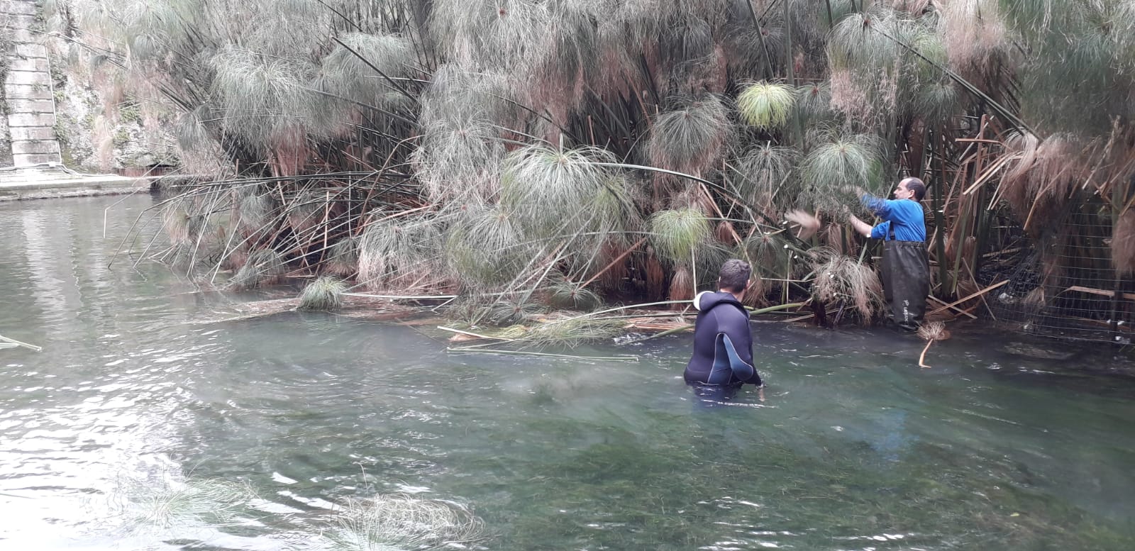 Sono cominciate questa mattina le operazioni di pulizia della fontana Aretusa. Dopo diverse segnalazioni sul suo stato, il sindaco Francesco Italia ha chiesto l’intervento dei Ross, associazione di Protezione Civile. Coordinati dal presidente Carmelo Bianchini, sono scesi in acqua per una prima pulizia della vasca che va liberata dalle alghe cresciute a dismisura che, peraltro, hanno reso difficili i movimenti dei pesci all’interno. Alcuni sono persino rimasti “imprigionati”. Interventi anche sul papiro che cresce rigoglioso all’interno della fontana. I sei operatori Ross hanno potato le piante, tagliando i fusti spezzati o piegati e facendo giusto spazio per garantire una ottimale sopravvivenza del papiro. Nonostante la temperatura gelida dell’acqua, i lavori sono andati avanti per diverse ore. Tutto il materiale raccolto sarà ora avviato in discarica secondo apposite procedure.