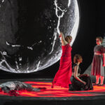 Chiaro fin dalle prime battute che ampio spazio trovano gli effetti: visivi, con due grandi led , sonori, per colpire l’attenzione degli spettatori. Ai lati del palco, due pianoforti, suonati quasi costantemente in scena, per accompagnare le varie fasi della tragedia. Una grande parete riflettente chiude la scena.