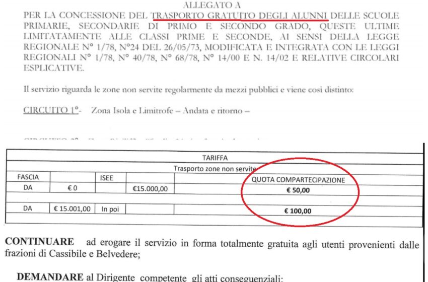Un titolo errato in un allegato del capitolato di servizio trae in inganno. Si legge “trasporto gratuito degli alunni delle scuole primarie, secondarie di primo e secondo grado” per i residenti in contrada Isola e zone limitrofe o Tivoli e zone limitrofe. Ma, come chiariscono dagli uffici comunali, è appunto “un errore nel titolo”. Per la verità ripetuto in almeno un altro passaggio del capitolato che regola il servizio.