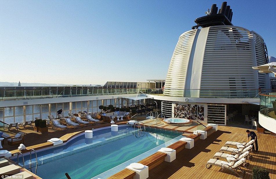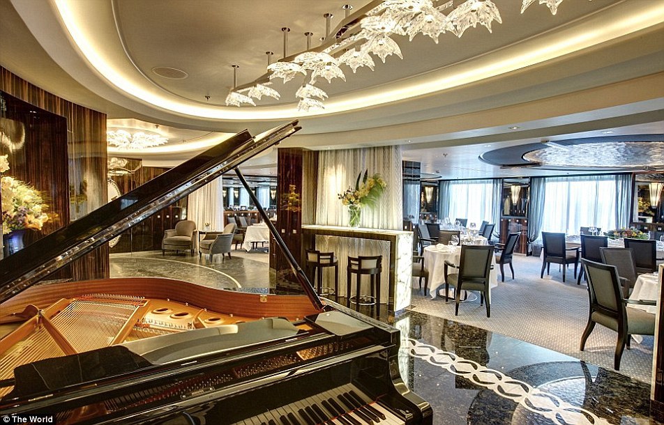 The World è una nave da crociera particolarmente prestigiosa e, particolarità, residenziale. Gli appartamenti, nelle diverse formule, si acquistano, per centinaia di migliaia di euro. All’interno, quattro ristoranti, tre bar, una boutique, il centro fitness, la sala da biliardo, un simulatore di golf, il campo da tennis, la pista da jogging. Immancabile una Spa, la piscina, il teatro, al biblioteca. Ospita circa 200 persone.