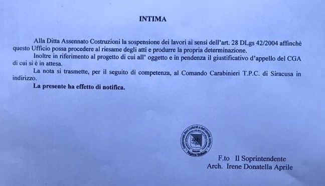 L’atto intima la sospensione immediata dei lavori, con notifica alla Ditta Assennato attraverso i Carabinieri del Nucleo Tutela Archeologica e “fa seguito analoga comunicazione dell’avvio del procedimento di Sospensione da parte del Comune di Siracusa”, aggiunge Granata.