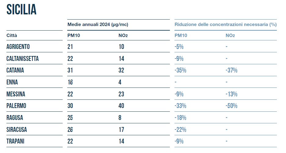I dati di Legambiente evidenziano che nel 2024 la concentrazione media annuale di PM10 a Siracusa è stata di 26 µg/mc, mentre per il biossido di azoto (NO2) si attesta a 17 µg/mc. Oggi il limite medio annuale è di 40 μg/mc per le pm10 ma dal 2030 la soglia scenderà a 20, come disposto con nuova direttiva europea. Siracusa dovrà ridurre le concentrazioni del 22%, intervenendo in particolare sul traffico che rappresenta la maggiore fonte di polveri sottili.