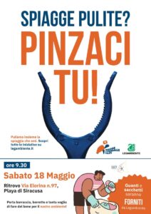 “Spiagge pulite? Pinzaci tu!” E’ lo slogan dell’iniziativa di Legambiente Siracusa, che con i ragazzi di “Regatta ESCP”, invita a dedicare la mattina di sabato 18 maggio a pulire la spiaggia della playa di Siracusa.