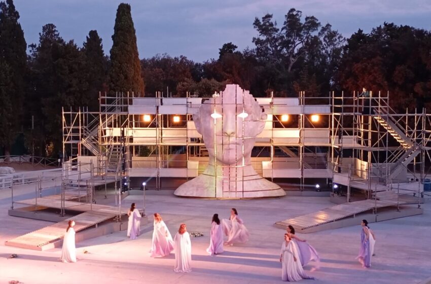 La scena richiama un palazzo appena disegnato da impalcature su tre livelli. Due pedane ai lati, al centro una grande testa di donna che prenderà poi vita grazie al visual, studiato per allargare il senso di drammaticità e spettacolo.